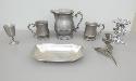 Pewter pitcher with 2 mugs, wine cup, bread dish, flower candlestick, candle holder, 20th century