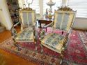 Lot 67: 1 (One) Pair of Empire style polychrome & parcel gilt arm chairs. scrolling foliate
