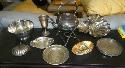 tea kettle on stand, goblet, 2 small trays, Revere bowl, salt & pepper shakers, porcelain dish with cocktail forks, 20th century
