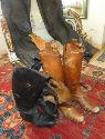 2 pairs of jumping boots, very worn boots with stays, size 9, pair of leather chaps, riding gloves, 4 English crops, 20th century
