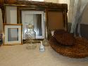 Lot 241: 1 (One) 2 vintage baskets, hand blown covered jar, 3 large & 2 small gold frames,